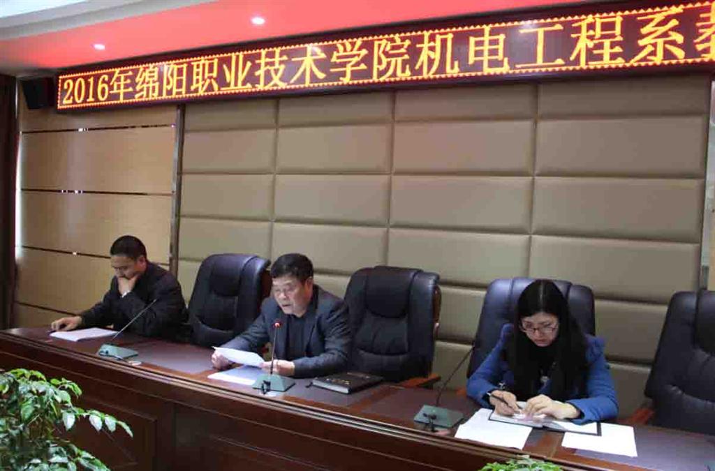 系主任邓先智做《机电工程系2016年教职工大会工作报告》,并提交大会审议。报告从教学管理、专业建设、师资队伍、科研水平、课程建设、实训基地、技能竞赛、对外合作等十个方面回顾了系教学工作,从学生日常管理、学风建设、安全教育、心理健康、学生活动等五个方面回顾了系学生工作,并就招生就业、党建工作两个方面作专题总结,报告最后就本年度系部工作中存在的主要问题进行了分析。