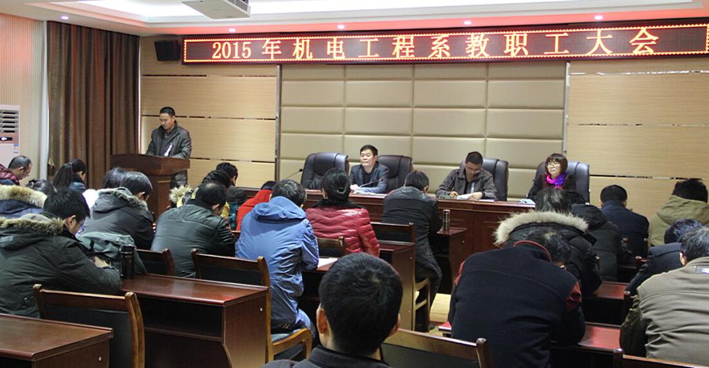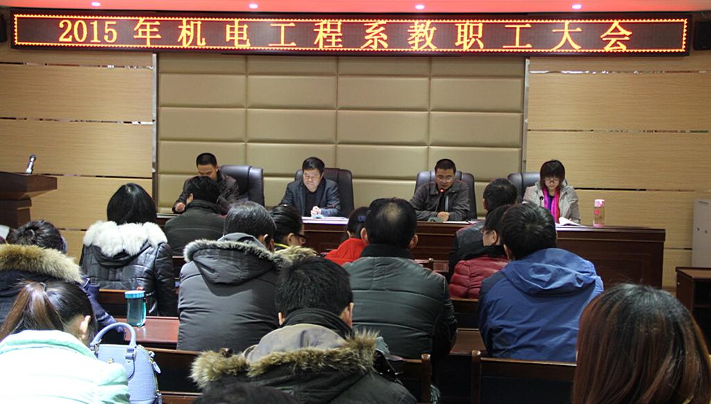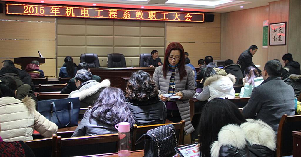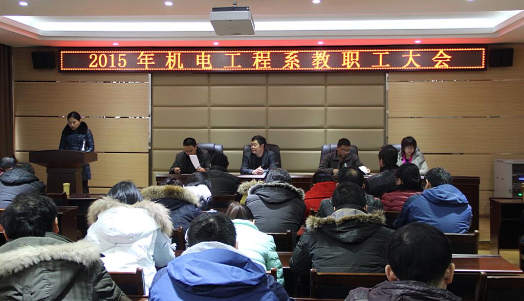 2016年1月6日下午,机电工程系在精业楼二楼会议室召开了第一届第四次教职工大会。48名教职工参加会议,9名教职工因有教学任务或出差在外等情况请假,到会人数超过机电工程系教职工人数的2/3,符合法定人数,会议有效。会议由我系老师戴星主持。