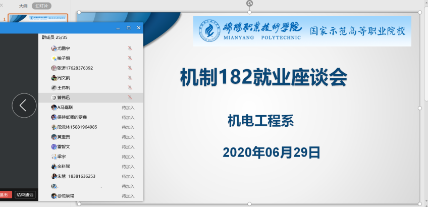为进一步提高学生就业意识,了解当前就业形势,提前做好就业准备。6月29日20点,由辅导员熊超有老师主持召开了机械设计与制造182班在线就业座谈会,座谈会特邀成都富士康人力资源部招聘经理唐毅做经验分享,全班35名同学积极参加。