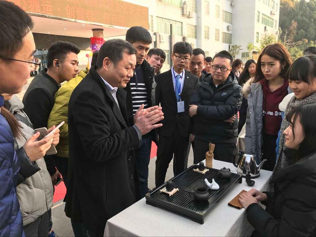 作品展出得到领导的广泛关注。上午10点,张明、胥勋涛饶有兴趣地参观了各展区作品,听取了各系负责人作品特点的介绍。在信息工程系展区,张明还与学生们交流便携式恒温烙铁等两项专利作品的创意理念、制作过程,听取他们对产品内涵的阐释和创作过程的讲解。随后,汪涌泉深入各系展区进行了解,他对各展区作品表现出的科技创意、艺术思考、人文情怀给予充分肯定,并在机电工程系展区观看了四轴无人机飞行表演。下午3点,左明扬来到作品展区,对于学生作品中表现出鲜明的专业特色给予好评,并在茶艺展示区与同学们就茶艺进行深入交流。