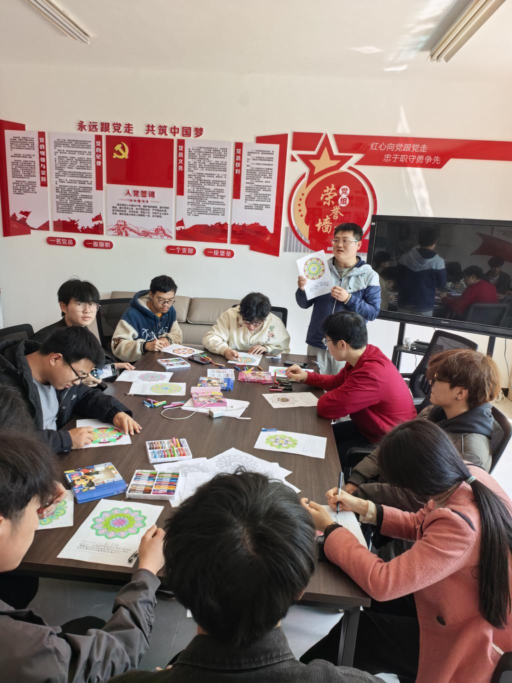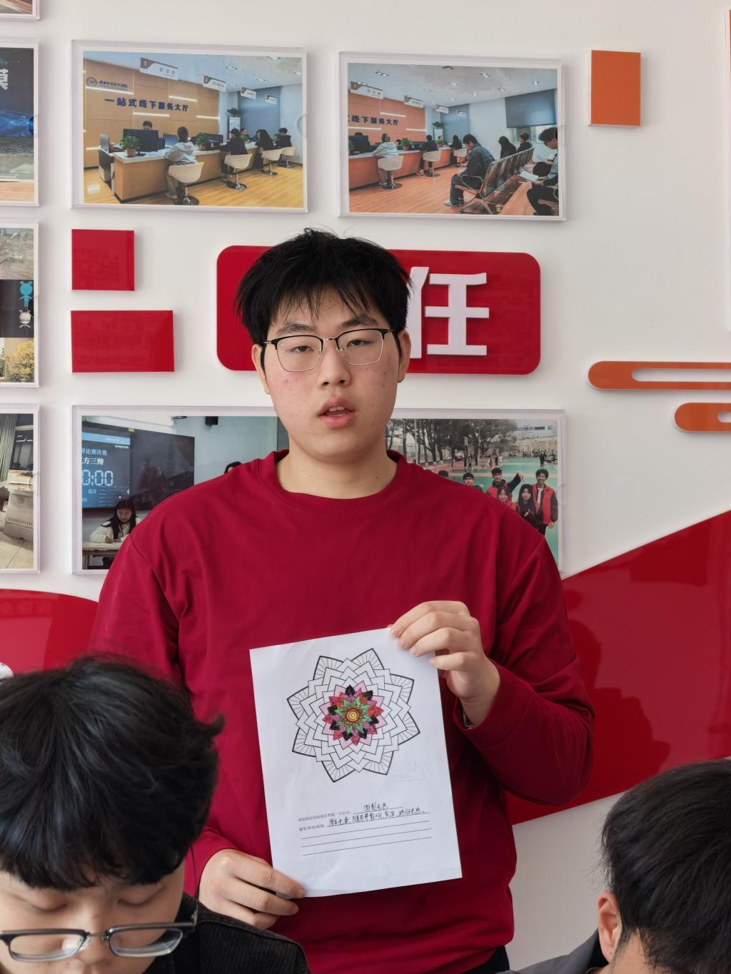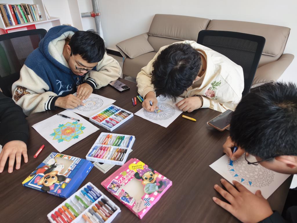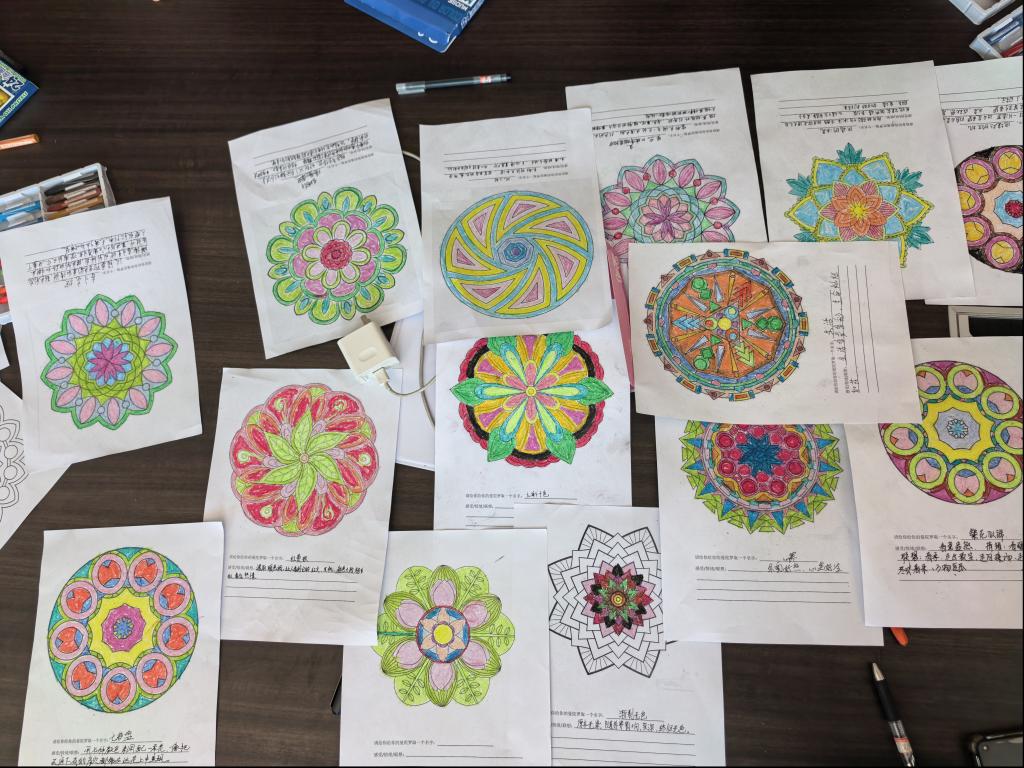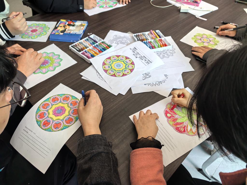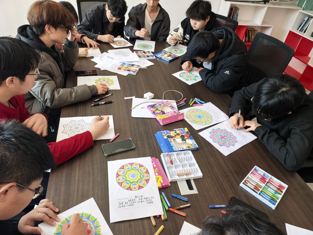 本次团辅以曼陀罗心灵疗愈为核心载体,围绕认知调整、情绪管理两大核心目标设计环节。活动现场,同学们以曼陀罗花为创作基底,在轮廓勾勒、色彩填涂中沉浸式释放学业生活压力,用斑斓色彩展现内心丰富的精神世界,在静心创作中聆听自我、接纳自身情绪。活动同步设置沉浸式互动游戏、心语书签抒写、心理诗歌创作等环节,引导学生完成深度自我探索;专设心理减压指导区,为有需求的同学提供一对一心理咨询,精准对接差异化心理需求。