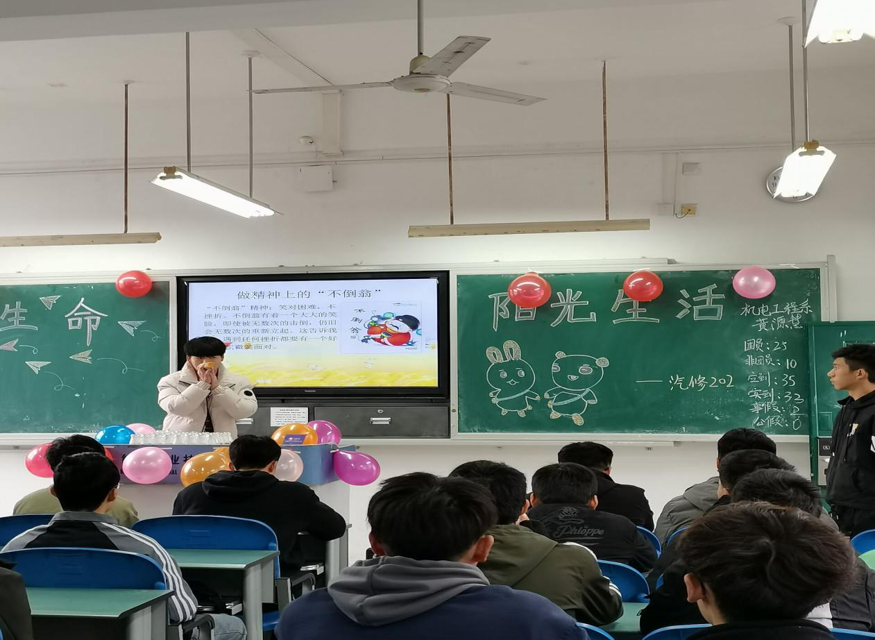 为深入贯彻落实上级有关文件精神,切实加强学校心理健康教育工作,全面提高学生心理素质,促进学生健康成长,11月24日,机电工程系在我校综合楼召开了“珍爱生命,阳光生活”心理主题班会,机电工程系心理部组织各班同学们参加了此次主题活动。