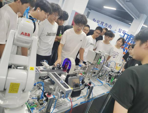 在电气自动化实训室,新生们对机电一体化设备、1+X机器人实训平台以及数字生产单元表现出浓厚兴趣。现场由学长学姐进行设备操作演示与详细讲解,使同学们直观了解自动化技术的实际应用,不少同学踊跃参与互动体验,现场气氛活跃。