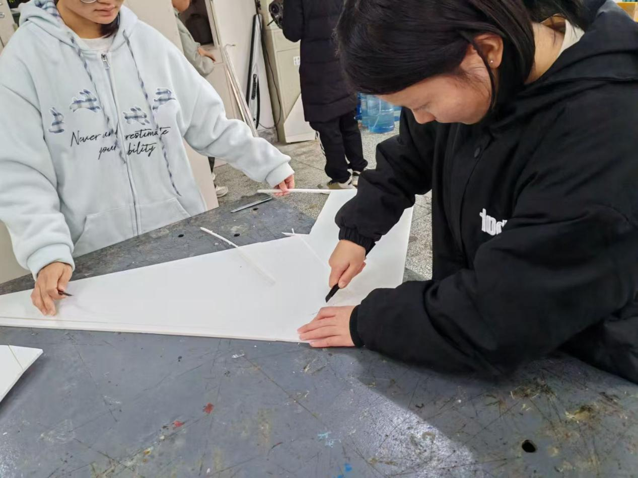 活动伊始,鲲鹏协会技术指导同学进行手把手教学,同学们分组协作制作固定翼航模。从精准裁剪KT板到细致调试舵机,大家分工明确、协作攻关。心理部志愿者同步开展引导工作,鼓励大家在专注动手的过程中沉淀心绪,将学业烦恼转化为实践动力。当日下午,足球场已划定清晰的安全飞行区域,飞行教练以“一对一”形式指导同学们操控遥控器,当亲手制作的航模腾空盘旋时,现场学子欢呼不已,纷纷感叹“既酷又解压”。