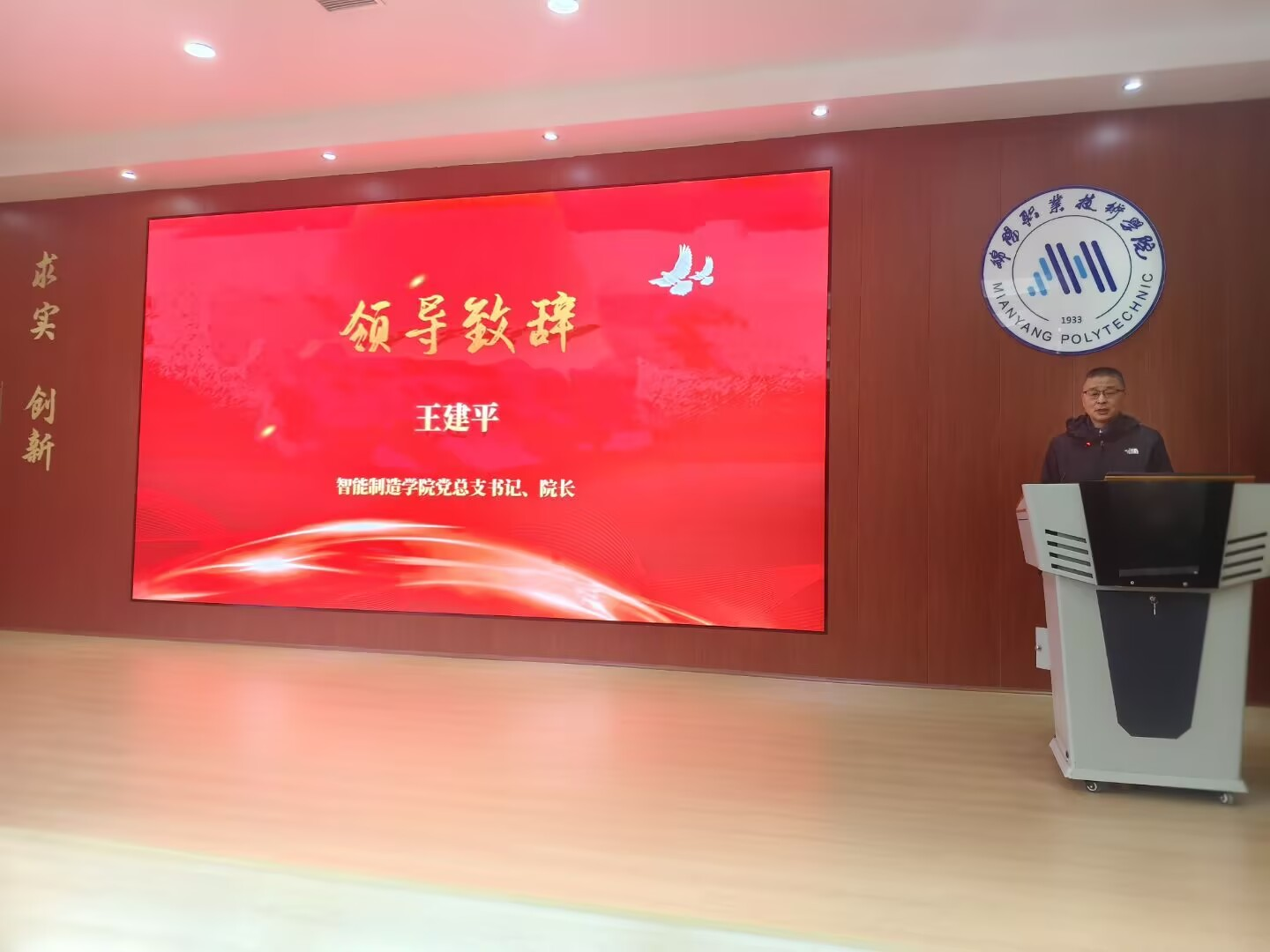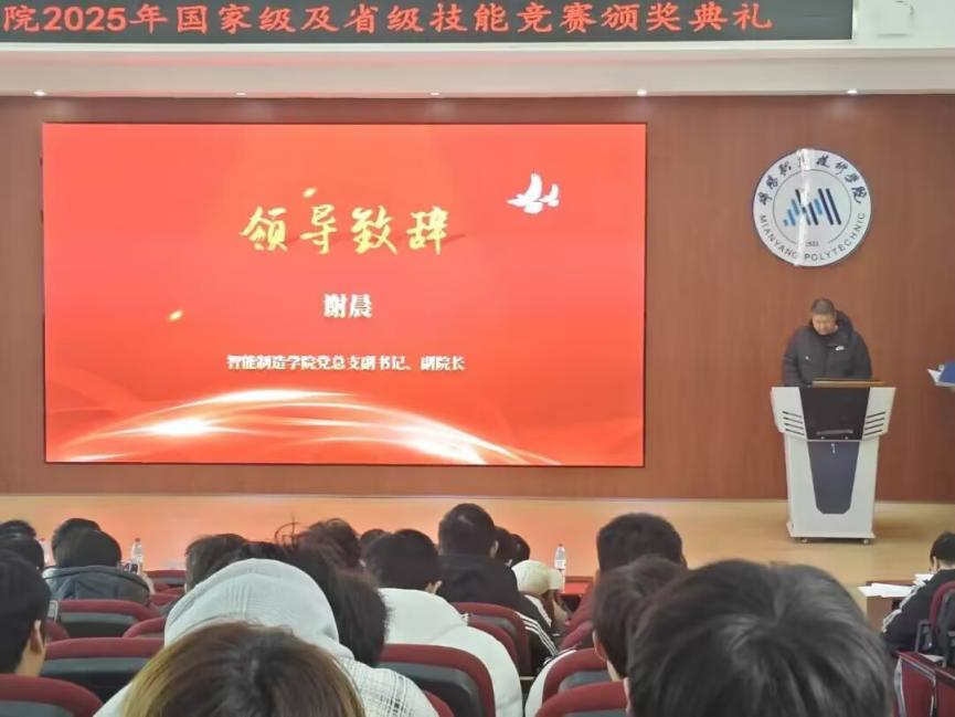 典礼伊始,学院党总支副书记、副院长谢晨发表致辞。他指出,此次国家级和省级竞赛佳绩的取得,离不开党支部的坚强引领与大学生社团育人工作室的扎实赋能。学院始终将技能培养融入党建工作主线,构建起“党建 + 竞赛”的特色育人模式,为赛事筹备、选手培训提供全方位保障;大学生社团育人工作室则搭建了常态化技能实训平台,成为培育高素质技能人才的重要沃土。