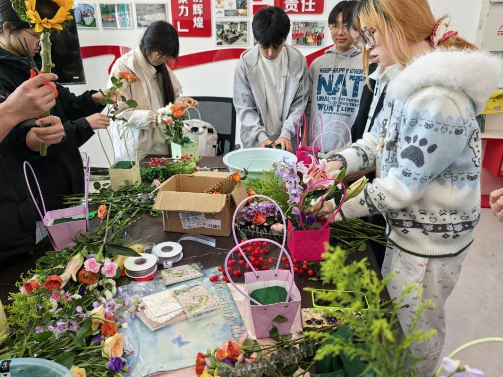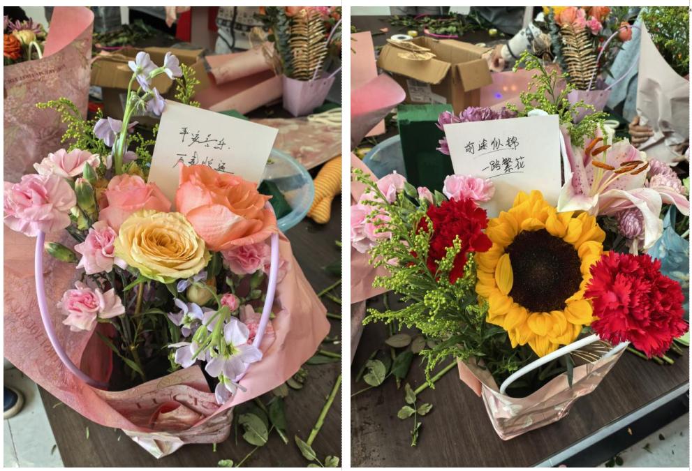 活动伊始,毛鹏枭老师结合美育浸润要求,介绍了插花艺术的历史与美学内涵,强调其既是美育实践,也是舒缓压力、助力心理健康的有效方式。随后,专业花艺师现场讲解花材认知、修剪搭配等技巧,指导同学们创意创作。同学们专注实践,将多种花材巧妙组合,每件作品都彰显独特审美与心声。