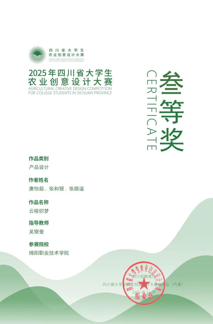 近日,在四川省农业创意设计大赛中,智能制造学院团队打造的“云梭织梦” 作品凭借对非遗蜀锦文化与农业创意的精妙融合,从众多参赛作品中脱颖而出,斩获省级三等奖,为学校在农业创意设计领域再添佳绩。