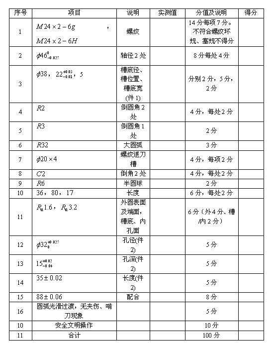 参照国家职业技能标准数控车工中级技能操作要求,依据选手完成工作任务的情况,按照考核标准进行评分。评分方式采用过程评价与结果评价相结合,工艺评价与功能评价相结合,能力评价与职业素养评价相结合。