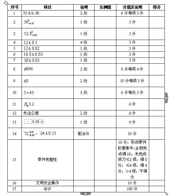 参照国家职业技能标准钳工中级技能操作要求,依据选手完成工作任务的情况,按照考核标准进行评分。评分方式采用过程评价与结果评价相结合,工艺评价与功能评价相结合,能力评价与职业素养评价相结合。