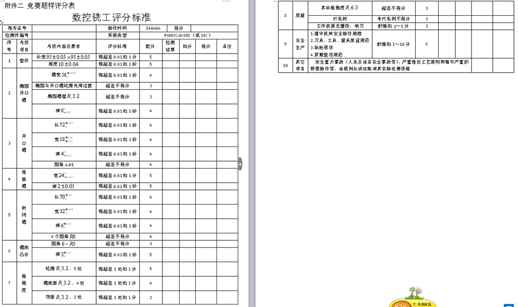 8.竞赛过程中,大赛裁判组将考核各位参赛选手的安全文明操作情况和加工工艺应用情况。出现非安全文明操作的要作好记录,并在成绩评定中酌情扣分。