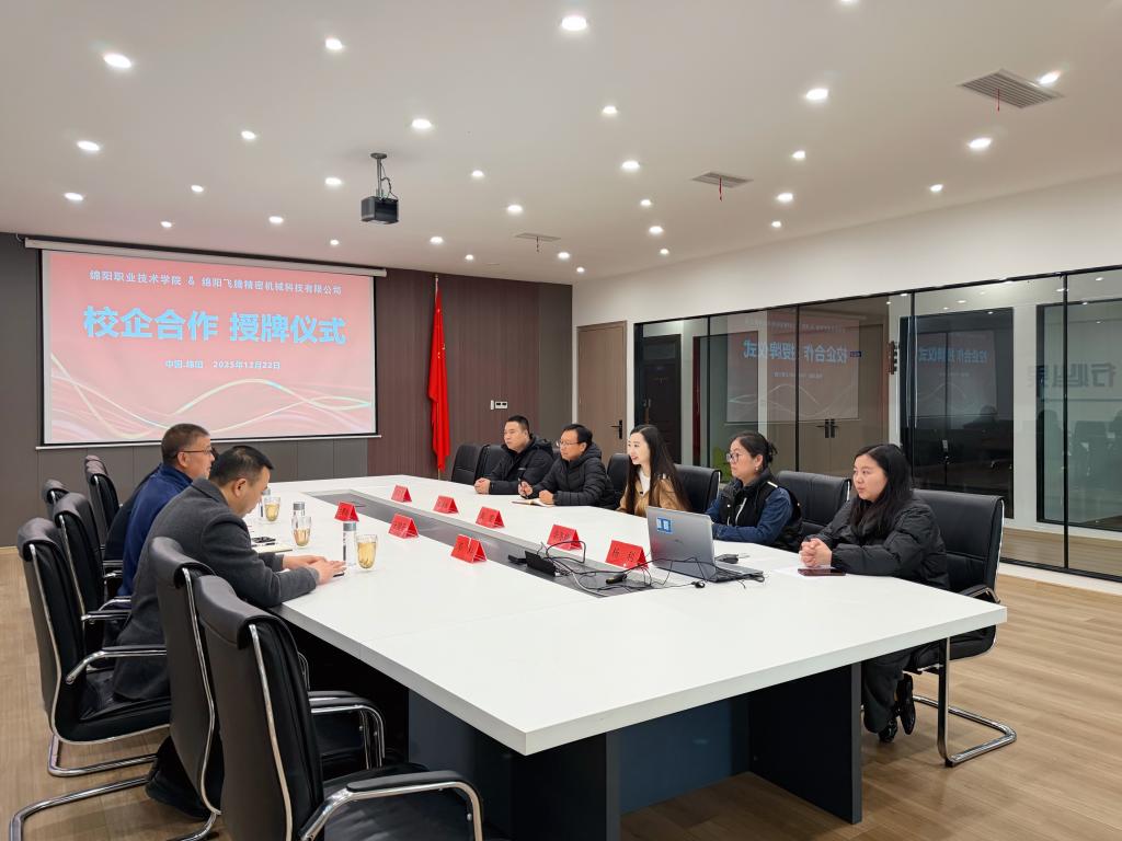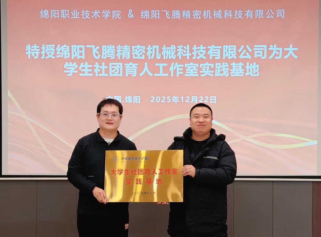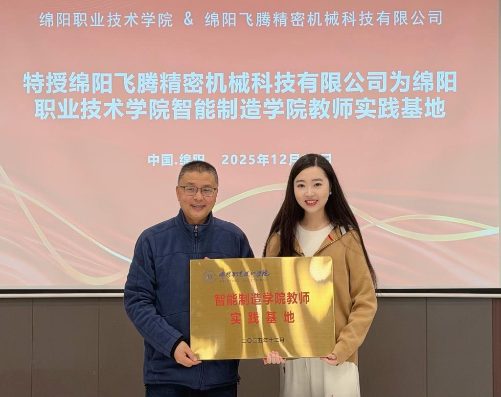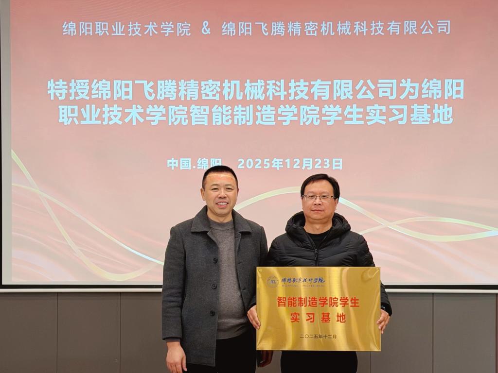 2025年12月23日上午9时,绵阳职业技术学院智能制造学院与绵阳飞腾精密机械科技有限公司校企合作授牌仪式顺利举行。智能制造学院党总支书记、院长王建平,校外实习办公室主任邓科,辅导员代表毛鹏枭,以及绵阳飞腾精密机械科技有限公司董事长兼总经理黄雯,人事部部长杨利,生产部部长胡显友等双方代表出席仪式。现场依次为“教师实践基地”“学生实践基地”“大学生社团育人实践基地”完成授牌,标志着双方产教融合深度合作正式启动。