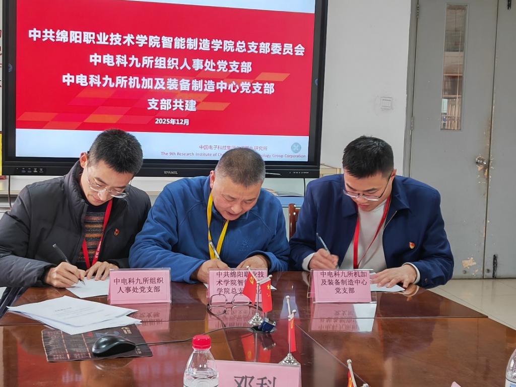 2025年12月17日,绵阳职业技术学院智能制造学院党总支书记、院长王建平率领学院综合办公室主任及相关教师代表,赴中国电子科技集团公司第九研究所(以下简称“中国电科第九研究所”)开展党支部结对共建协议签署活动。此次活动旨在通过党建引领,深化产教融合,推动协同育人,实现共赢发展。