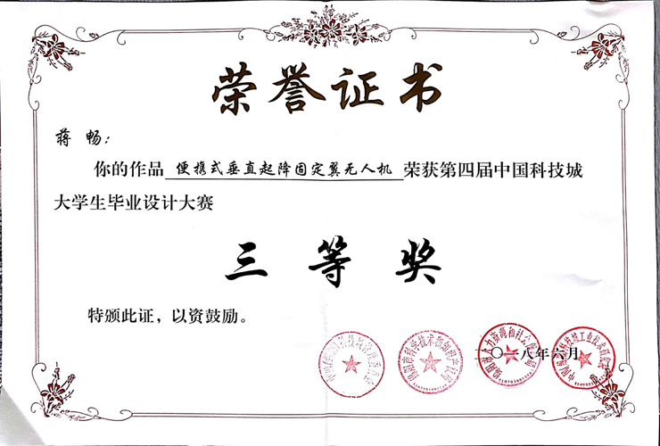 2018年6月15日,第四届中国科技城大学生毕业设计大赛决赛在绵阳孵化大楼多功能厅隆重举行。我系学生蒋畅、王志远的《便携式垂直起降固定翼无人机》、《集成螺丝刀》分别荣获三等奖和创意奖。