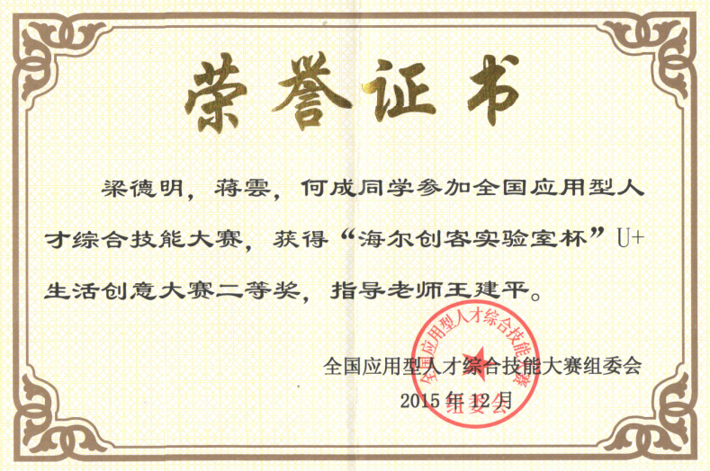 日前,2015全国应用型人才综合技能大赛在北京举行。机电工程系有15支队伍参赛,梁德明、何成、蒋雲制作的“多功能手机支架”进入“海尔创客实验室杯”U+生活创意大赛决赛,获得二等奖。另有9支代表队获得三等奖。