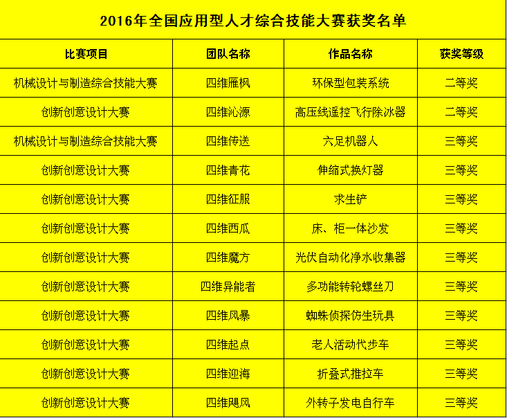在机械设计与制造综合技能项目中,王鑫、梁德明、吴字鲜设计的“环保型包装系统”获得二等奖;张家琼、何成、钱宗敏设计的“六足机器人”获得三等奖。