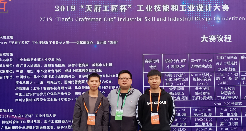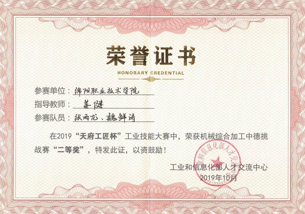由工业和信息化部人才交流中心主办的“2019天府工匠杯工业技能和工业设计大赛”于10月29日至31日在成都市蒲江县举行。机电工程系选派了张雨龙(数控182)、魏鲜涛(机制172)两位同学代表我院组队参加了大赛的“机械综合加工中德挑战赛”赛项,并获得了该项目二等奖的好成绩。