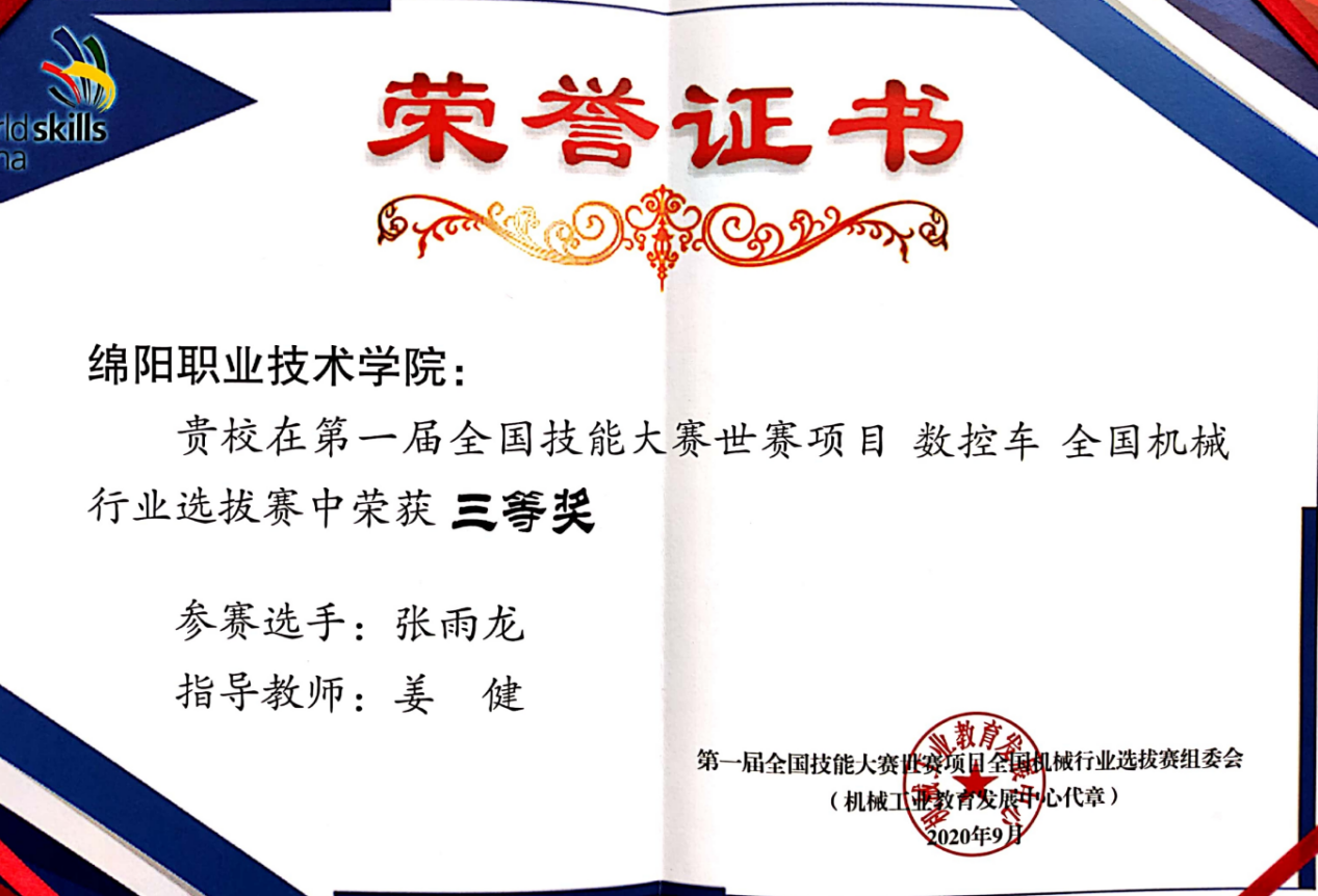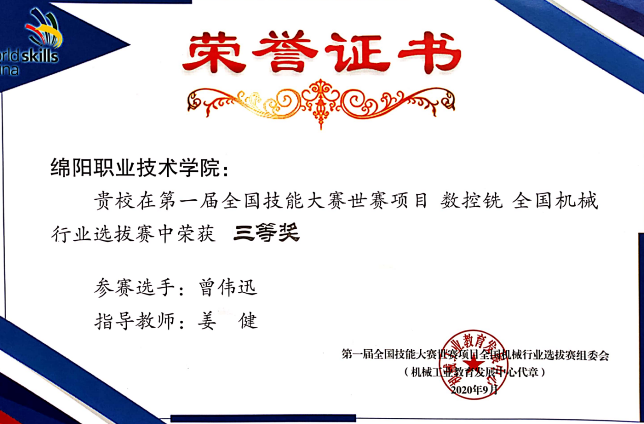 2020年9月15-23日,机电工程系学生张雨龙(数控技术182班)、曾伟迅(机械设计与制造182班)分别代表我院参加了“第一届全国技能大赛世赛项目全国机械行业选拔赛”的数控车、数控铣两个项目比赛。经激烈角逐,张雨龙获得“数控车三等奖”、曾伟迅获得“数控铣三等奖”。