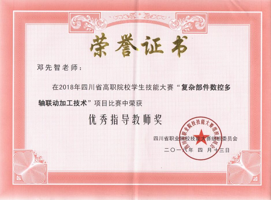 本次比赛,我系共派出两支队伍,与来自四川航天职业技术学院、成都航空职业技术学院、四川交通职业技术学院、成都工业职业技术学院、宜宾职业技术学院等八所院校的15组选手进行对决。经过激烈的角逐,由数控151A班王志远、数控152A班肖萍组成的团队获得四川省高职院校学生技能大赛“复杂部件数控多轴联动加工技术”项目比赛团体一等奖。团队指导老师姜健、邓先智获得优秀指导教师奖。