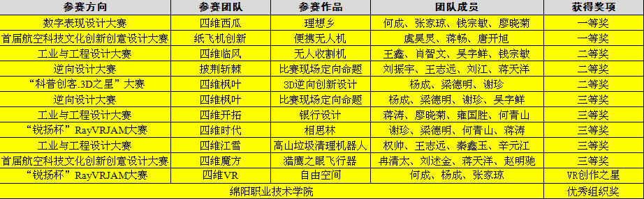 为取得优异成绩,我系积极组织学生在暑假进行精心准备,完成大赛所要求的设计主题和内容,最终作品得到了评委会的肯定。由何成、张家琼、钱宗敏、廖晓菊组成的“四维西瓜”团队,其作品“理想乡”获得数字表现设计大赛一等奖。虞昊炅、蒋畅、唐开旭组成的“纸飞机创新”团队,其作品“便携无人机”获得首届航空科技文化创新创意设计大赛一等奖。“四维临风”团队作品“无人收割机”获得工业与工程设计大赛二等奖,“披荆斩棘”团队作品“比赛现场定向命题”获得逆向设计大赛二等奖,“四维枫叶”团队作品“3D逆向创新设计”获得科普创客·3D之星大赛二等奖;“四维枫叶”团队作品“比赛现场定向命题”获得逆向设计大赛三等奖,“四维开拓”团队作品“银行设计”获得工业与工程设计大赛三等奖,“四维时代”团队作品“相思林”获得“锐扬杯”RayVRJAM大赛三等奖,“四维江雪”团队作品“高山垃圾清理机器人”获得工业与工程设计大赛三等奖,“四维魔方”团队作品“猎鹰之眼飞行器”获得首届航空科技文化创新创意设计大赛三等奖;“四维VR”团队作品“自由空间”获得“锐扬杯”RayVRJAM大赛VR创作之星。此次大赛获奖学生共计41人次。
