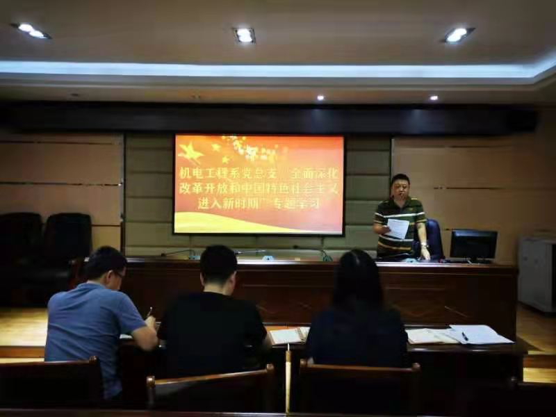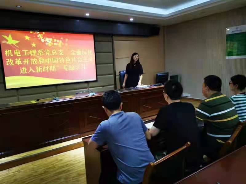 为进一步深入学习贯彻党的十九大精神,增强党员干部党性修养,6月30日,机电工程系党总支开展了“全面深化改革开放和中国特色社会主义进入新时期”专题学习。