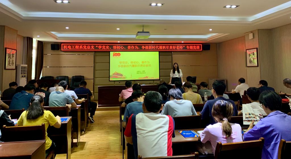 为深入学习贯彻习近平总书记在党史学习教育动员大会上的重要讲话精神,推动党史学习教育取得新实效,6月30日下午,机电工程系党总支副书记周琴为本系教师党员和在校学生党员上了一堂“学党史、悟初心、善作为,争做新时代履职尽责好老师”的专题党课。