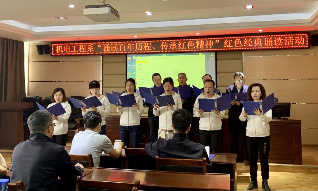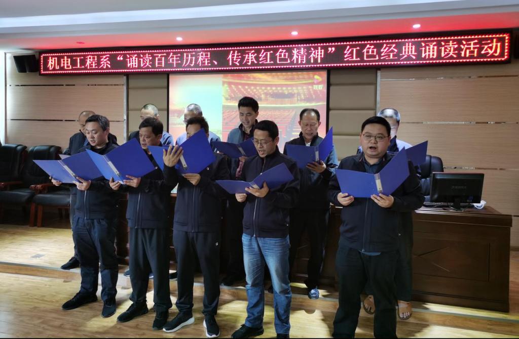 2021年是中国共产党成立100周年,这一百年是筚路蓝缕、奠基立业的一百年,是创造辉煌、开辟未来的一百年。为庆祝这一伟大时刻,激励广大教师积极主动学习党的历史,不忘初心,牢记使命,按照机电工程系党总支党史学习教育安排,5月12日下午两点半,机电工程系全体教师在机电大楼会议室开展了“诵读百年历程、传承红色精神”红色经典诵读活动。