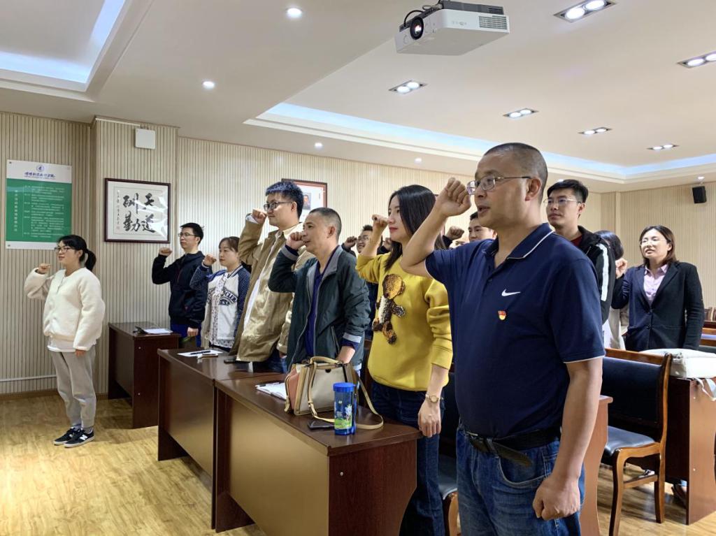 第二部分内容是党员教师们重温入党誓词的集体宣誓活动。党员们重温入党时的情景和状态,提醒自己不能忘记自己的身份,增强党性观念,积极为党工作。