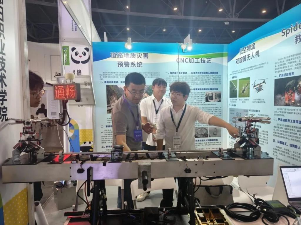 参展团队聚焦技术前沿,带来Spider洞穴侦查救援先锋机器人、双旋翼低空物流无人机、道路地质灾害预警系统等自主研发成果。从理论研讨到实践打磨,从设计构思到调试优化,入党积极分子与团员骨干充分发挥先锋模范作用,带领团队日夜攻坚,让创新作品既具技术深度,又蕴含人文关怀,吸引众多观众驻足关注,成为学校展区的亮眼风景。